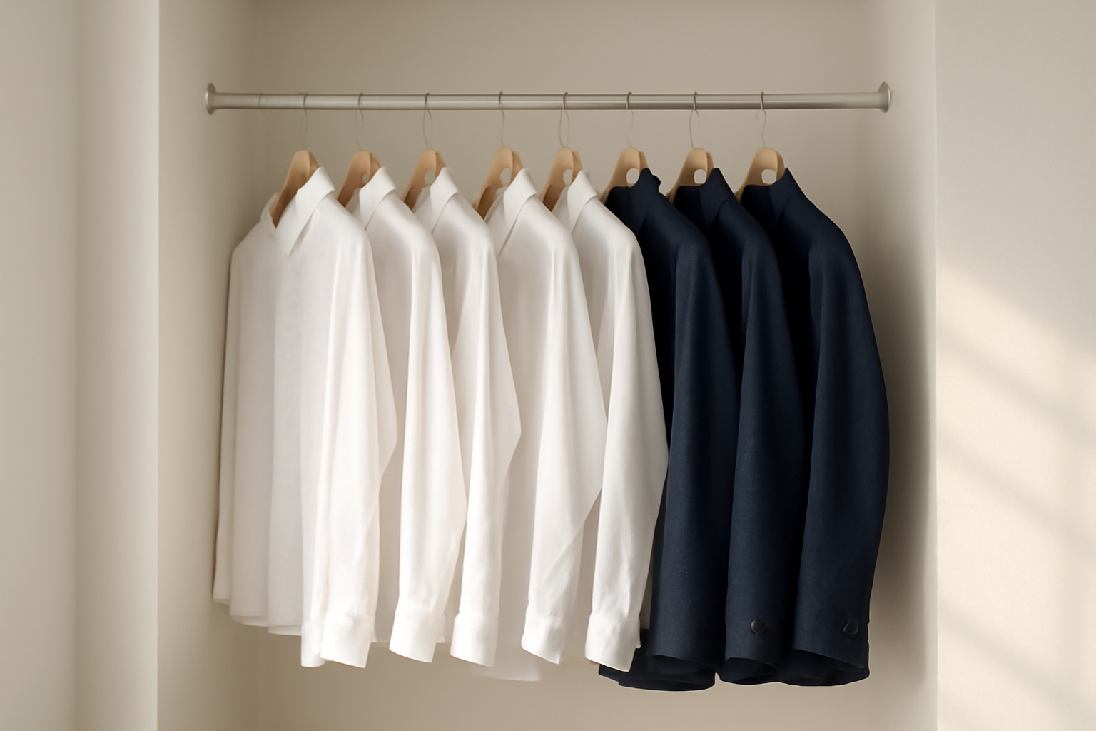 월요일: 흰셔츠 + 검정바지 + 네이비재킷