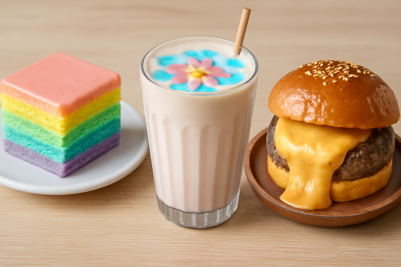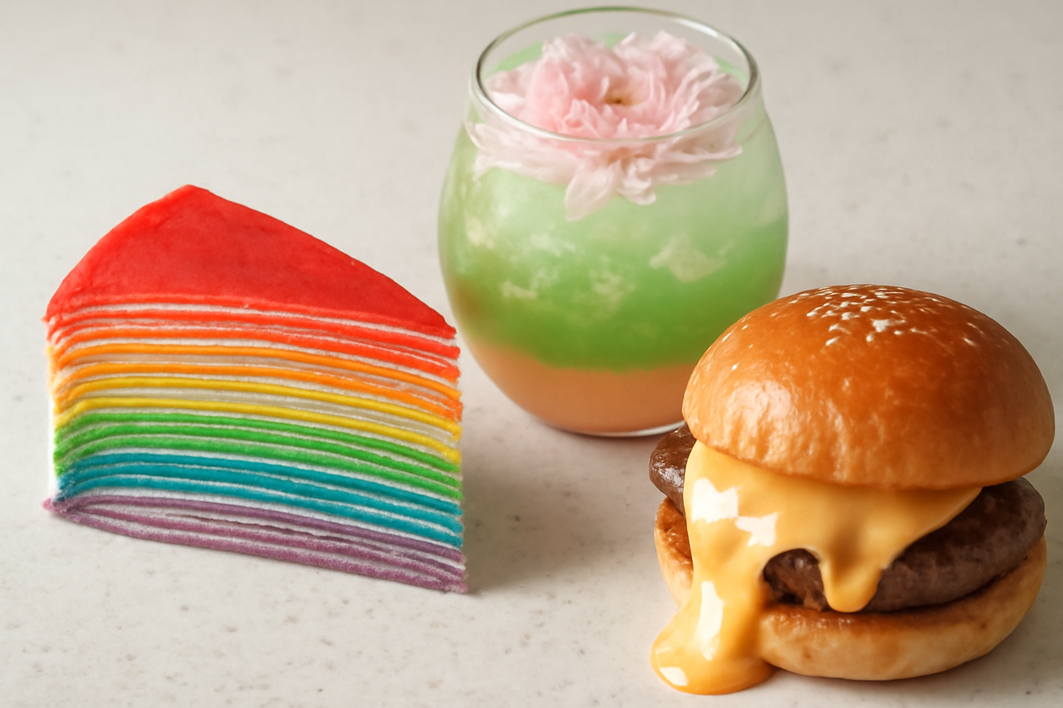 첫째, 비주얼이 화려한 음식들이에요. 무지개 색깔의 디저트나 꽃처럼 피어나는 음료, 그리고 칼로 자르면 안에서 치즈가 폭포처럼 쏟아지는 버거까지! 보기만 해도 침이 고이는 비주얼 맛집들이죠.
